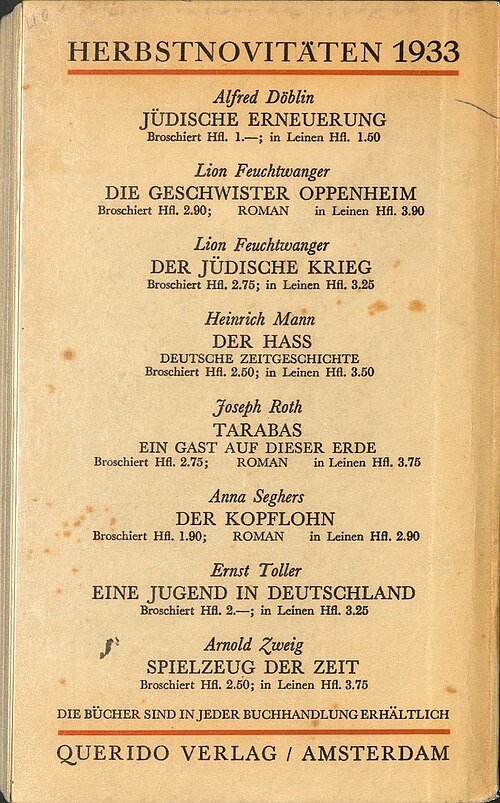 “Manja. Ein Roman um fünf Kinder” erschien 1938 bei Querido in Amsterdam, in dem viele der “verbrannten Dichter” eine neue Heimat gefunden hatten. (Links ist ein Auszug aus dem Verlagsprogramm mit den Neuerscheinungen aus dem Herbst 1933, das sich wie ein Who’s who liest.)