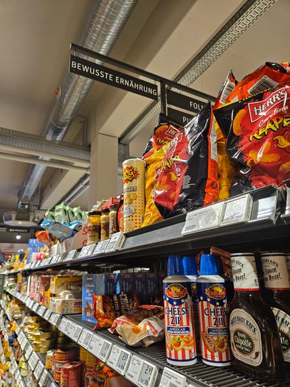 “Bewusste Ernährung” steht in diesem Supermarkt offensichtlich als Synonym für “Alles, worum ich schon in Amerika einen sehr großen Bogen gemacht habe”. So ne Dinge wie Sprühkäse, Schokosirups (-sirüppe?) und Steaksoßen mit je 123% Zuckeranteil, vollkommen überwürzte Fettchips und vieles mehr…