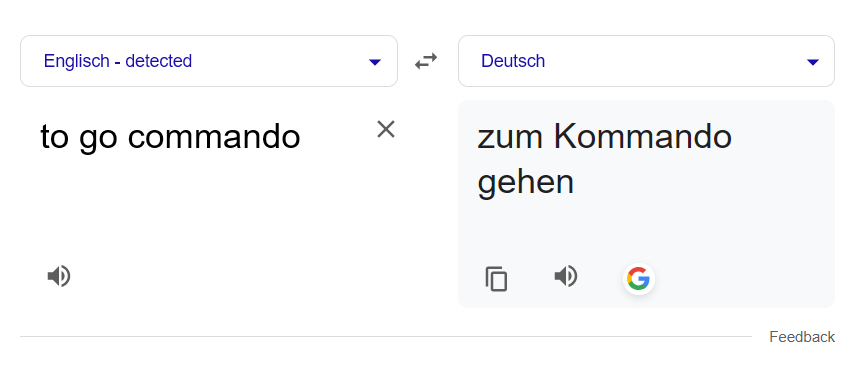Ach so, ja: “to go commando” hat nichts mit Vorgesetzten zu tun, sondern bedeutet lediglich, keine Unterwäsche zu tragen.