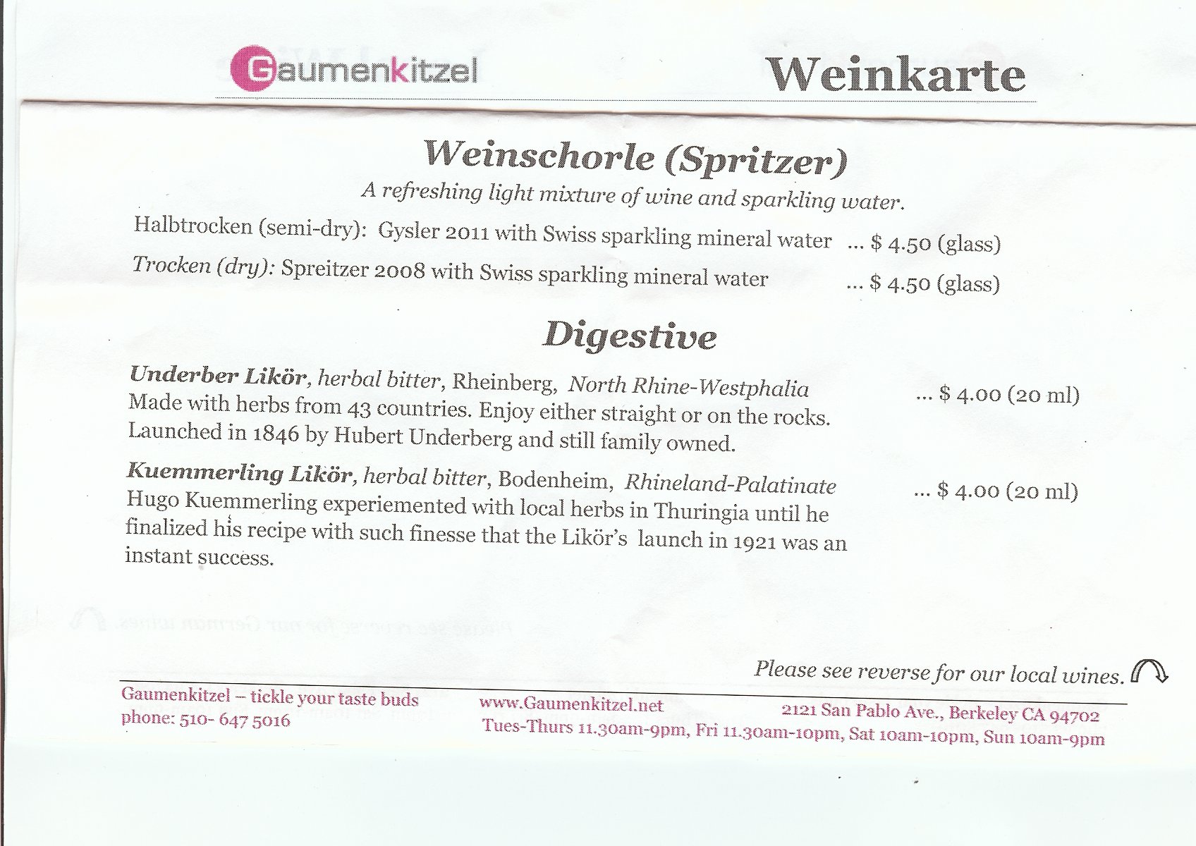 Zum Abschluß gab’s Schnitzel im “Gaumenkitzel”, wo man Spirituosen eigentümliche Namen gibt.