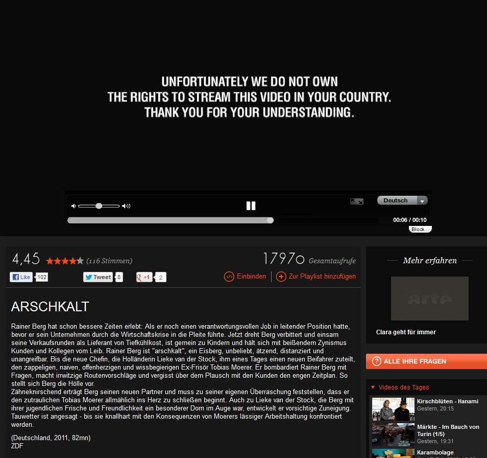 Also 1., Arte: this land is not my land und 2. habe ich der GEZ solchermaßen viel Geld in den Rachen geschoben, daß es lässig für meinen kleinen Bedarf an ExPat-TV reichen sollte und 3. ist es einfach unverschämt, mich arschkalt im Regen stehen lassen. Hah!