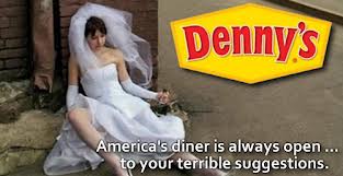 Denny’s ist eine der ältesten Restaurantketten in den USA und serviert genau das, was man von einem Diner erwartet. Burger, Steaks, Sandwiches, Milchshakes und fette Frühstücke. Das Konzept funktioniert nicht einmal mehr in Amerika richtig gut und darum setzt Denny’s jetzt auf neue Zielgruppen: entweder jung oder nerdig genug, um sich wieder eine Peter Jackson Verfilmung des Hobbit anzusehen (http://bit.ly/17Ad8Qf) oder willens, den Bund fürs Leben zu schließen und sich im neueröffneten Las Vegas “Dine & Merry”-Denny’s für $95 inkl. Denny’s-T-shirts und Pancake Puppies Hochzeitstorte das Ja-Wort zu geben.