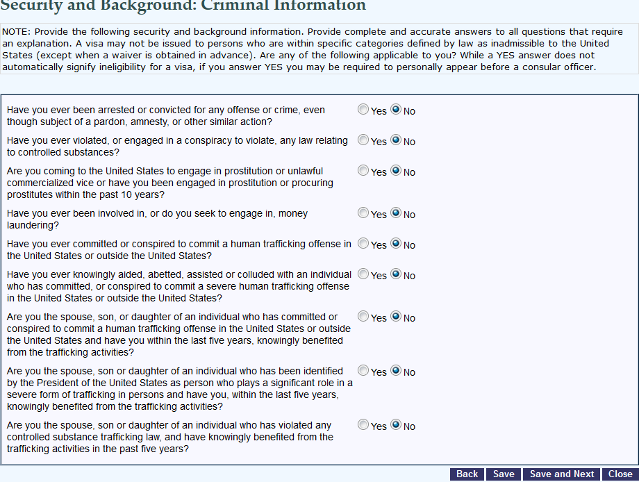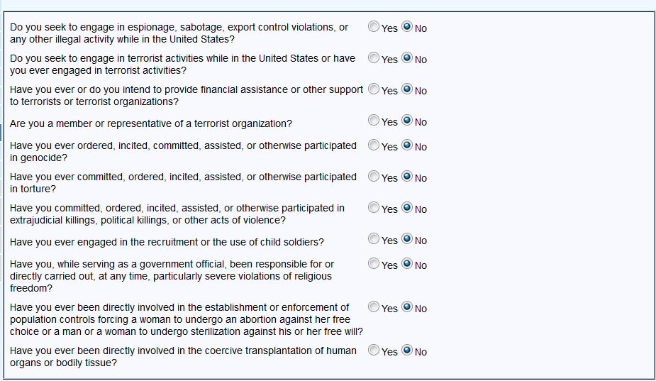 Statt den sonnigen Sonntag irgendwo draußen zu verbringen und bei diesem wunderbaren Wetter Helden zu zeugen (oder wenigstens faul auf dem Liegestuhl zu lümmeln und herauszufinden, wer es dieses Jahr auf die Time Magazine Liste der 100 einflußreichsten Menschen geschafft hat und warum) kreuze ich zum Behufe der Visaverlängerung Neins an. Im Titel des Blogposts die meines Erachtens schwachsinnigste Frage (außer vielleicht, jemand möchte in Utah einwandern), nachfolgend die anderen. (Sehr hübsch finde ich, daß ein Ja dem Aspiranten nicht zwingend die Visaeignung entzieht, sondern eine Einladung zum Gespräch mit dem Immigration Officer nach sich zieht. Enhanced questioning, anyone?)