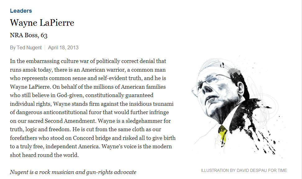 Da komme ich nach stundenlangem Visa-Antrag-Ausfüllen endlich doch zu Liegestuhl und Time Magazine und was muß ich in der Rubrik “Leader” lesen? Eine ganz grausige Lobeshymne auf den Obermufti der NRA, Wayne LaPierre. (Man beachte: Amerikaner haben das Recht Waffen zu tragen direkt von Gott bekommen; die Verfassung ist bestenfalls als Protokoll göttlicher Verfügungen zu werten.)
