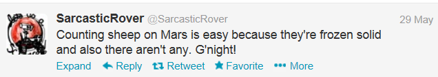 Keine Ahnung warum, aber ich fühle mich der Curiosity Mars-Mission sehr verbunden. Wahrscheinlich, weil ich mitgefiebert habe, als die NASA den Rover auf dem Mars gelandet hat. Wurscht. Den folgenden Zeitrafferfilm von Karl Sanford finde ich sehr faszinierend: http://bit.ly/12Q5FKd