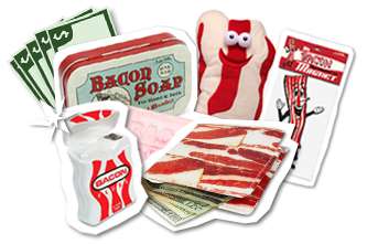 Da bestellt man einmal wegen hüftlahm und ans Haus gebunden bei einem Essenslieferdienst und wuppdich haben die einen auf ihrem E-mail-Verteiler und schicken einem so Zeugs wie dieses: Nothing says ham-handed like a fistful of bacon-themed prizes. (Sinngemäß übertragen: Nix sagt Wurschtfinger so sehr wie wurschtige Preise.) Win These Meat Mementos (Fleischmemorabilien), rufen sie mir zu und kriegen sich dann vor lauter lustig gar nicht mehr ein: Speckduftseife, Zahnseide mit Speck-Aroma, eine Speckbrieftasche und – wuhahaha – ein sprechendes* Speckkopfkissen. Wenn ich nicht schon keinen Facebook-Account hätte, würde ich mir dafür nun schon extra keinen zulegen.