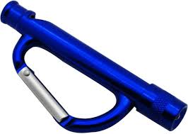 Was haben wir denn da? Eine orangefarbene Sicherheitsweste mit Reflektorstreifen. Und wie die stinkt! Gleich anziehen, bettelt sie, “pretty please with sugar on top.”** Als nächstes bekommen wir eine Krönung amerikanischen Ingenieursschaffens (links) geschenkt: einen Karabiner mit integrierter Trillerpfeife – oh mein Gott, jetzt kriege ich den Michi Mittermaier und seinen Flugzeugabsturzsketch nicht mehr aus dem Hirn – und, jawohl, Damenundherren, es geht noch besser, kaum zu glauben aber wahr, mit ebenfalls integrierter Taschenlampe und made in China. Wow! Bei mir wurmt sich NDW-Markus ins Ohr und so langsam bahnt sich eine Migräne an. Letzte Übung: die Batterie einsetzen, drei Mal an die Decke blinken, einmal blasen. Weil das so schön klappt, bekommt jeder ein Tombola-Los zur Belohnung. Vorne jubiliert es weiter, da sähen wir mal, ohne die richtige Ausrüstung sei doch die schönste Katastrophe nichts. Sie habe ja unter jedem Tisch bei sich zu Hause ein solch unentbehrliches Utensil geklebt, denn wenn sich wg. der alten Erdbebenregel “Duck-Cover-And Hold On” jemand unter einen Tisch verkrochen habe, sei doch nichts leichter, als anschließend die Rettungskräfte herbeizupfeifen. Wie hilfreich wäre sowas etwa damals für ihre Freunde “in the Towers” gewesen? Oder für die beim Boston Marathon? Oder bei jedem fucking*** Erdbeben seit 1989? Keine Katastophe, wo sie nicht irgendwen mitten im Geschehen kannte. Außerdem müsse man als weiblicher Floor Warden möglicherweise auch in der Herrentoilette nach zu Evakuierenden suchen. Und da sei es doch angeraten, vorher zu trillern. Nicht, daß man in eine peinliche Situation gerate. Wo bin ich hier? Langsam beschleicht mich der Verdacht, daß ich zur Mithilfe bei der Therapie zur Bewältigung eines schlimmen Falles von Paranoia shanghait worden bin.