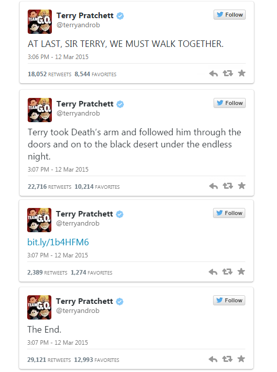 Mich hat das ein bißchen getröstet, an dem sehr traurigen Tag, an dem Sir Terry Pratchett mit dem Reaper Man mitgegangen ist.