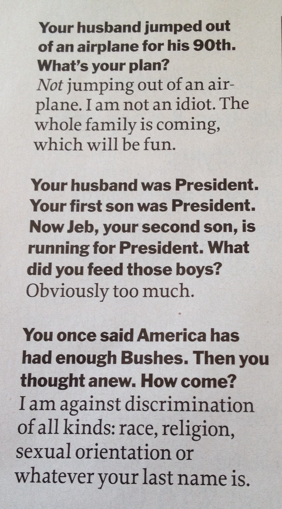 Barbara Bush, demnächst 90, im Interview. Angesichts des Witzes und der Schlagfertigkeit dieser Frau kann ich nur bedauern, daß offensichtlich die Gene des Gatten bei ihren Buben die dominanteren waren.
