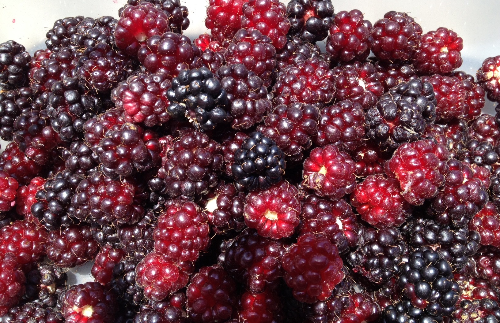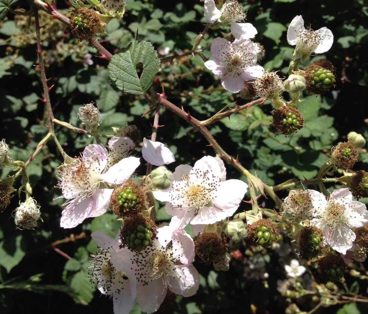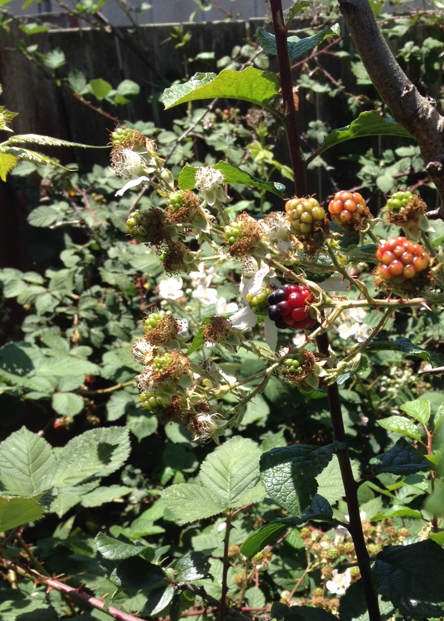 Von harmlos “Beeren pflücken” kann bei diesem Strauchmonster keine Rede sein: erstens liegt alles, was auch nur entfernt erntewürdig ist, hinter dicken Dornenbarrikaden, mit ganz bösen Widerhakenstacheln in allen erdenklichen Größen. Zweitens hat er Alliierte: den Oleander, eigentlich harmlos, aber sehr bewandert in biologischer Kriegsführung (Läuse), einen Dornbusch mit blauen Beeren, bei dem ich nicht sicher bin, ob das, was der tut, schon unter Chemiekrieg fällt. Die Beeren hinterlassen pfenniggroße violette Flecken auf Haut und Kleidung, die für den Versuch, sie mit Seife und Bürschte zu entfernen, nur ein mildes Lächeln übrig haben und außerdem setzt er dem, was er als Eindringling versteht, ganz konventionell Stacheln im Ausmaß von Schaschlikspießen entgegen. Darüber hinaus hat sich der Bromsauhund durch drei verschiedene Rosen gewuchert und die gibt es bekanntlich nicht ohne Dornen. Klingt schlimm? Geht schlimmer: auf und um jede Beere krabbeln hart kämpfende Ameisen. Wat soll isch sagen: They die hard. Ich habe es heute auf knapp ein Pfund Beeren ohne Zusatzproteine gebracht.
