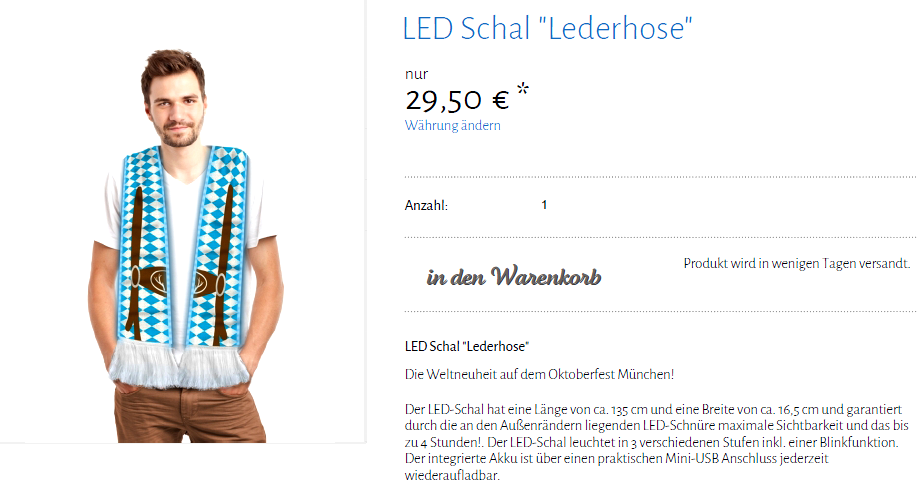 Oazapft wird erst am Samstag, aber das heißt ja nicht, daß es nicht schon allerlei Wiesn-Schwachsinn gibt. Zum Beispiel diesen Blinkerschal (ohne den Bartmann, im übrigen.)