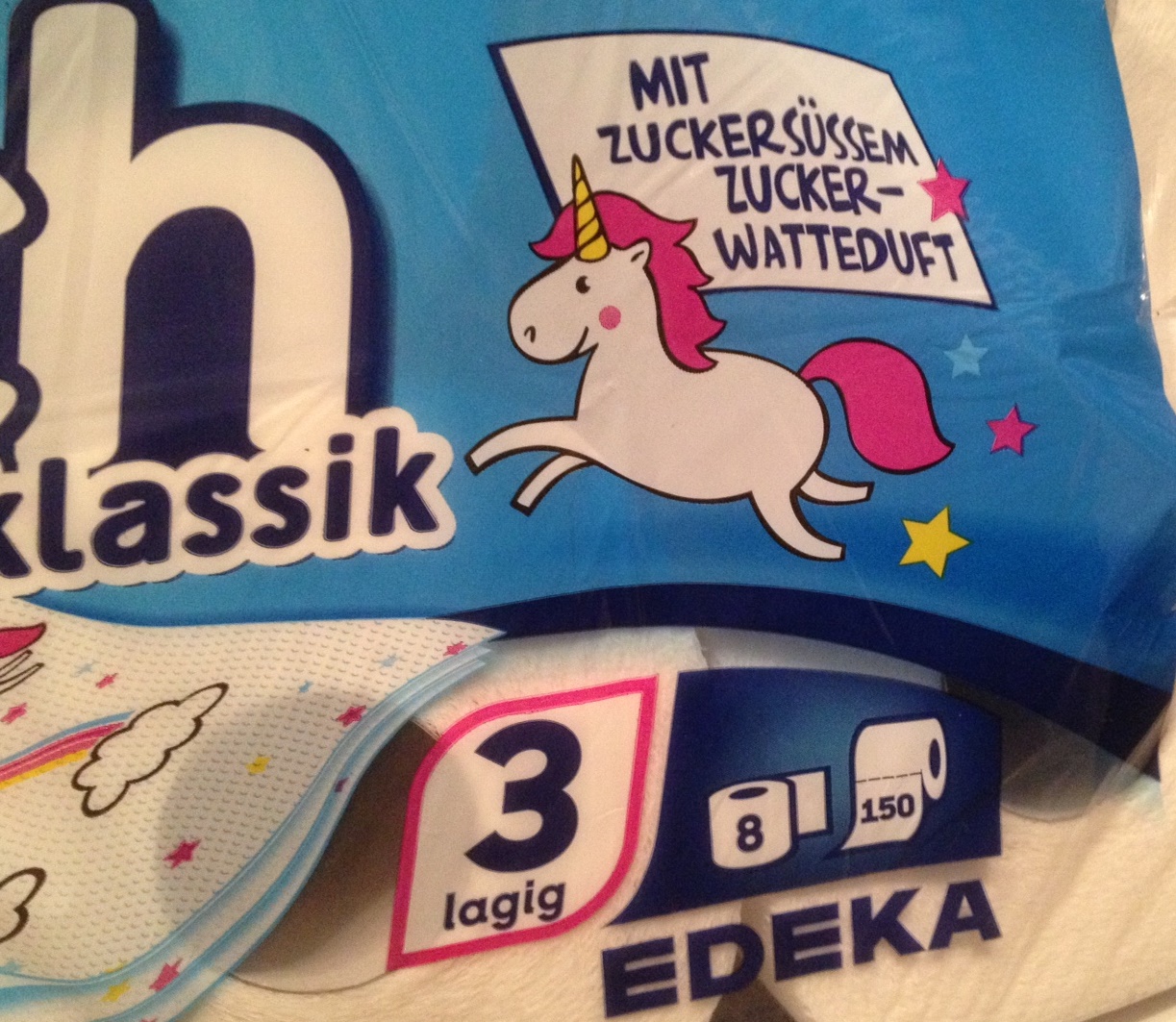 Offensichtlich habe ich nicht immer recht, denn es ist zur Zeit eine gar grĂ€Ăliche Einhornisierung zu beobachten. Und nicht etwa nur bei KleinmĂ€dchenzeugs, wo’s schon schlimm genug wĂ€re. Nein. Dieser Tage standen mein australischer Gast und ich recht fassungslos vor Einhornpralinenkugeln in den Geschmacksrichtungen Apfelkuchen-Pfefferminz sowie Schockschoko-BrummbĂ€r* und heute muĂte ich beim VerrĂ€umen meines Sonderangebotsklopapiers (doch, das ist meine Ausrede, dazu steh’ ich) feststellen, dass ich Einhornzellstoff erwischt hatte, mit sĂŒĂem Zuckerwatteduft. Ach, was sag’ ich. SĂŒĂ reicht denen nicht, es muĂ gleich zuckersĂŒĂ sein.