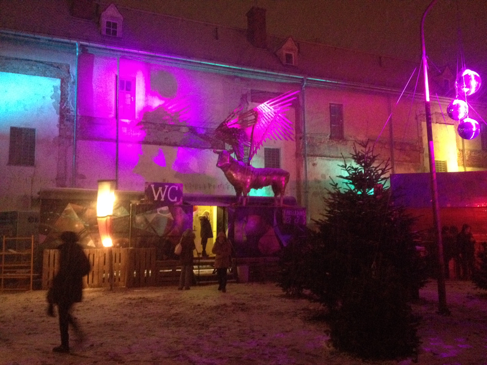 Als wir das Restaurant verlassen, um im Schlachthof noch einen Kaffee zu trinken, fängt es wie auf Stichwort an, heftig zu schneien. Schwere Flocken, die binnen Minuten das Viertel mit einer strahlend weißen Dämmdecke belegen. Eine seltsam verzauberte Atmosphäre entsteht, eine, in der es uns gar nicht wundert, dass aus einem der dicken Backsteingewölbe buntes Licht hervorblinkelt und Musik erklingt. Ohne uns lang abzusprechen, wechseln wir die Straßenseite und streben darauf zu. Und dann präsentiert sich in den Viehhöfen in der Ludwigvorstadt auf einmal etwas, was sich nach näherer Überprüfung nur als “Alternatives Tollwood” ( danke an Annette für den treffenden Begriff und sorry, Frau Rottenwallner) beschreiben läßt. So, wie Tollwood vor zwanzig Jahren mal war, mit Zirkuszelten und Veggie-Döner-Stand sowie Love & Würstel, Maroni und handgebissenem Schmuck aus schamanischen Kraftsteinen, Häkelgemüse, Wärmflaschen* und Öko-Schnaps, Tainted Rainbow Accessiours (nicht fragen), Steinersuchkollegen, Brazil-Groove und Glühbananen.
