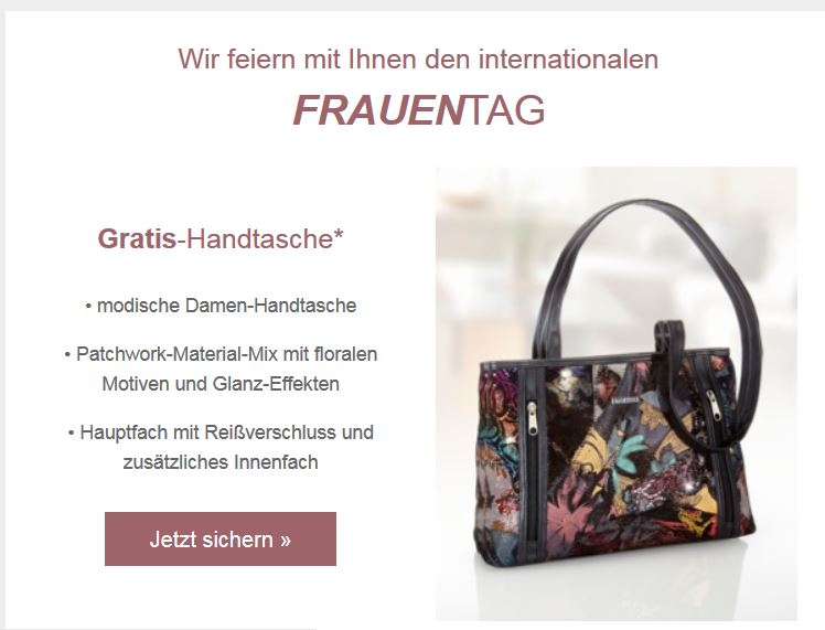 Und wir erfüllen Ihnen auch den Wunsch aller Frauen. Wie? Nein, nicht gleichen Lohn für gleiche Arbeit, so ein Quatsch. Sie kriegen, was jede Frau haben will – eine Handtasche. Mit Blumenmuster. Ansonsten Schnauze halten.