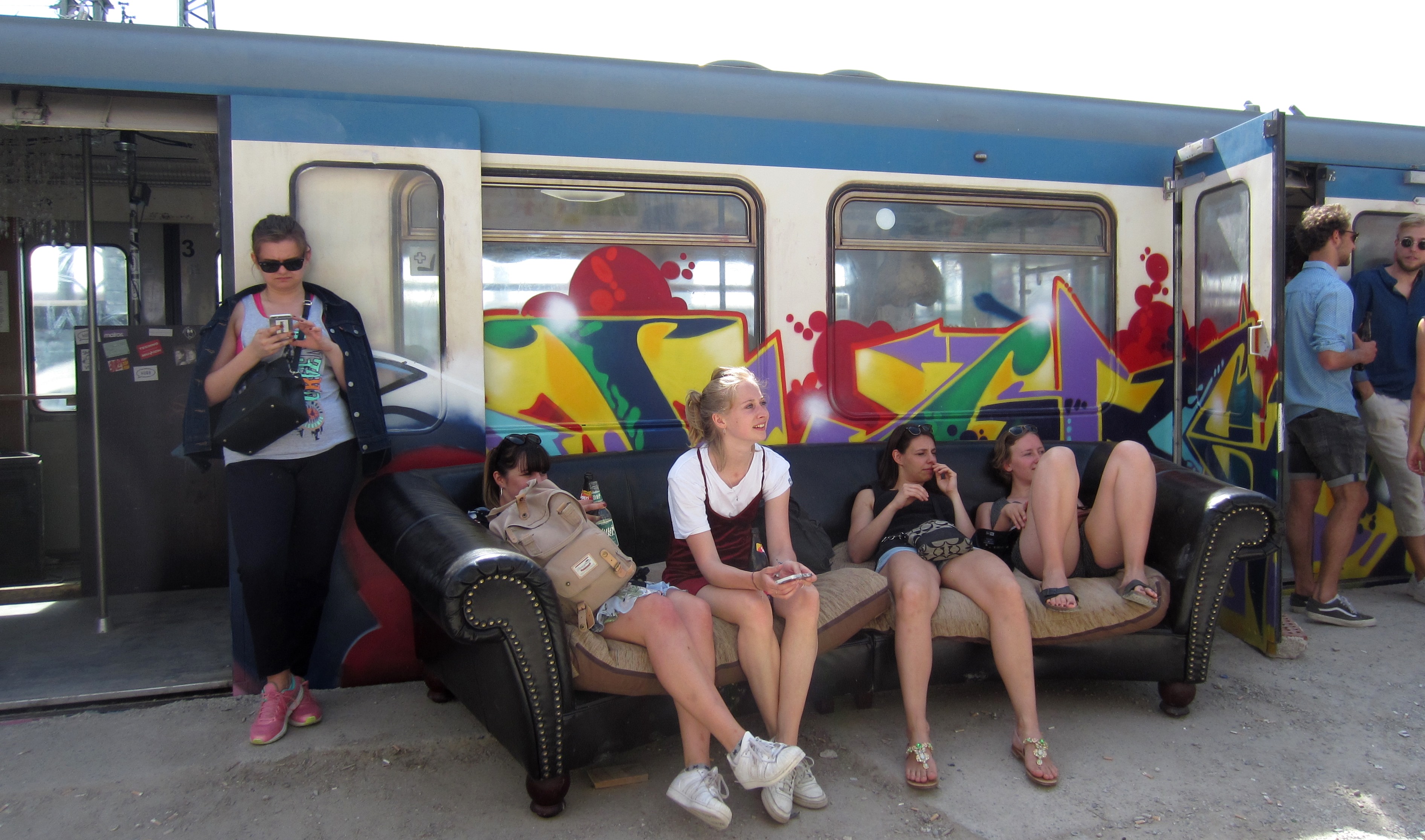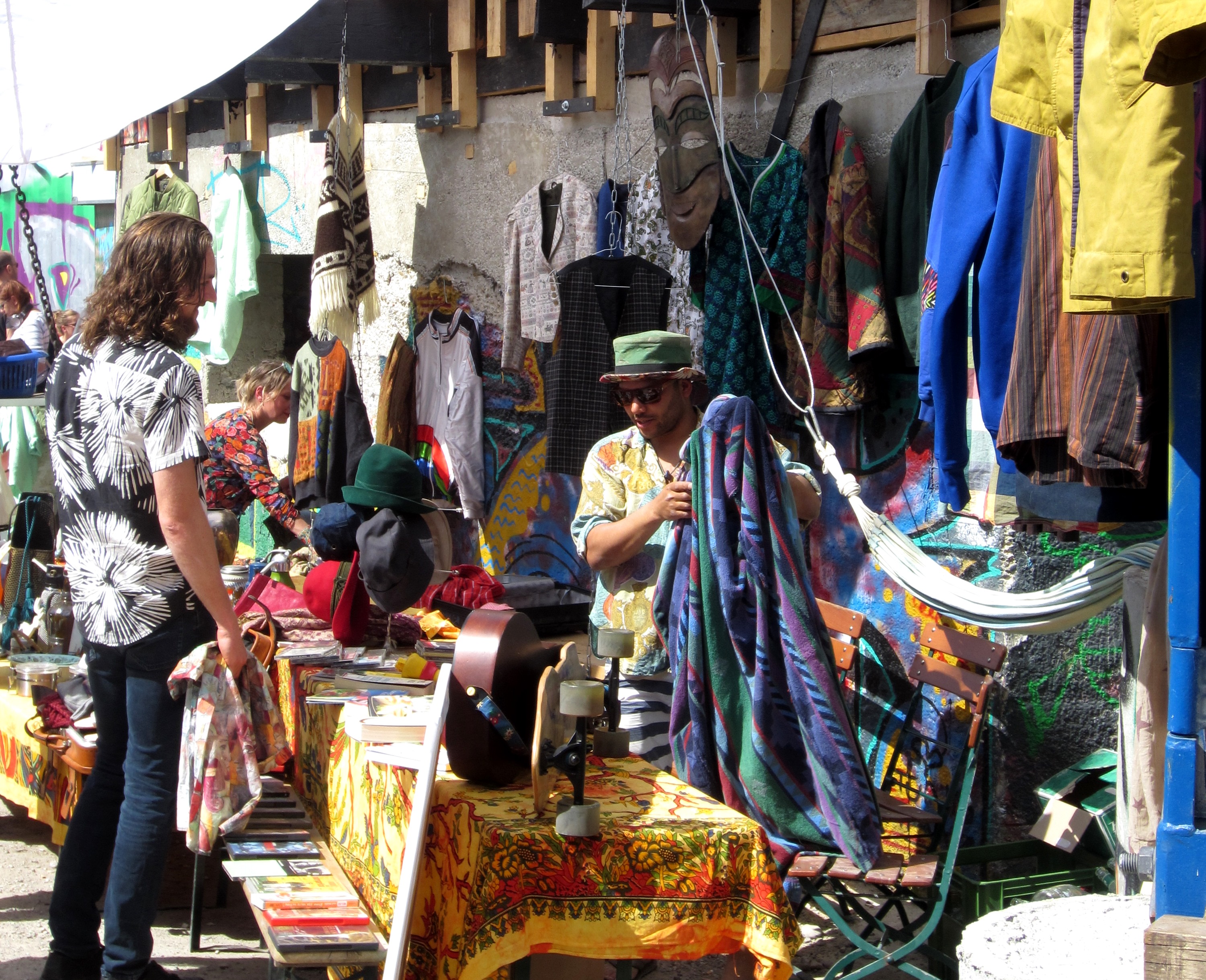 Ich war nämlich gestern beim Bahnwärter Thiel (http://www.bahnwaerterthiel.de/) auf dem Schlachthofgelände hinten, nein, nicht im Club, da gehts erst gegen Mitternacht los und macht dann durch bis morgen früh und immer umsta-umsta-umsta. Aus dem Alter bin ich raus. Ich war auf dem Flohmarkt. Der kostet Eintritt (it’s Munich, stupid), aber nicht arg viel (it’s alternativ, dummy), dafür gibts dann zum Flohmarkt saubere (!) Klos sowie hinreichend gekühlte Getränke zu kaufen, wichtig für einen Apriltag, der an der 30°C-Marke langschrammt. Die Händlerinnen trugen wenig in Petite-Größen und verkauften, was sie nicht mehr tragen wollen (was mich aus dem Kreis potentieller Kundinnen hinauskatapultierte), die Händler trugen auf die umgebenden Graffiti abgestimmte Knatschbuntgewänder und boten außerdem Schmuck und Asiengedöns, extrawarme Lamaponchos (der Arme!) sowie Unmengen von DVDs und eine interessante Auswahl an Gebrauchtbüchern feil.