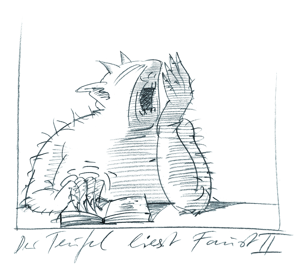 Am Ausgang liegt ein Gästebuch bereit und die Besucher dürfen mit Stickern abstimmten, ob sie nun Faust (geballt in gelb) sind oder Mephisto (Hörndl-Emoji, lila) oder Gretchen (rotes Herzerl). Halloho? Da fehlt doch wer? Teufelsweib, Kupplerin, Giftmischerin?