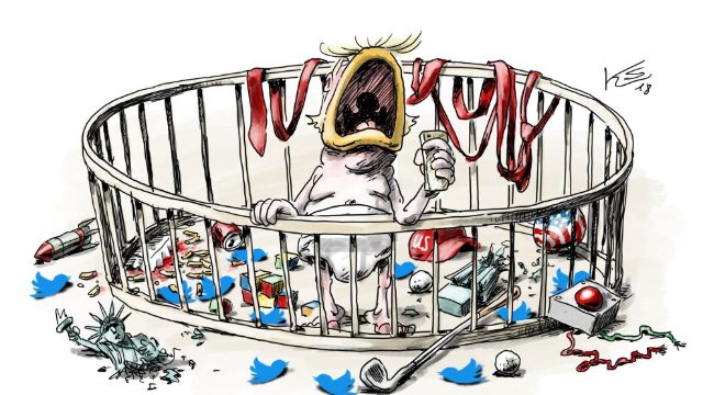 Wer meint, hier eine sehr gelungene Karikatur von 45s Oval Laufstall vor sich zu haben, aus der Zeit, in der das Woodward-Buch “Fear” und der Enthüllungsartikel eines anonym bleiben wollenden Verwaltungsmitarbeiters auf höchster Ebene in der NYT erscheinen, der hat vollkommen recht. Und hübsch ist sie auch.