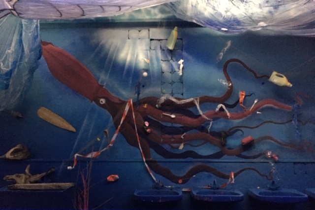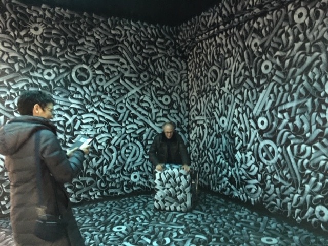 Im nächsten Raum lagen und standen große Schienen voller einzeln und aufwendig gestalteter Fliesen, deren ich am liebsten jede mitgenommen hätte, so gut gefielen sie mir. Und dann standen wir auf einmal mitten in einem plastikvermüllten Meer und bekamen Sand in die Schuhe. War in meinen Augen mehr Umweltpolitik als Kunst, aber darum nicht weniger interessant.