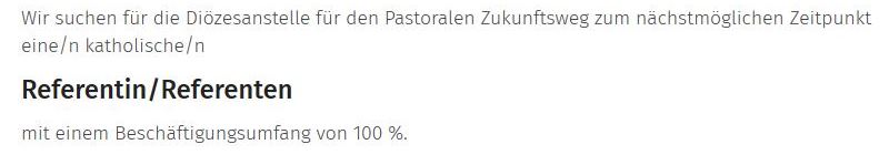 Dann würde ich vielleicht irgendwann herausfinden, was ein “Pastoraler Zukunftsweg” ist, wofür man da eine Referentin braucht und warum “Vollzeit” in der katholischen Kirche mit “Beschäftigungsumfang von 100%” übersetzt wird.