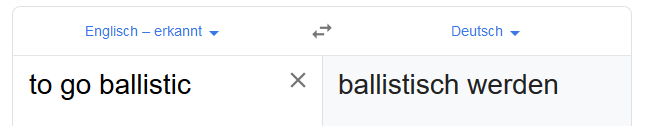 Was “ballistisch werden” bedeutet, weiß ich nicht. “To go ballistic” bedeutet ins Deutsche übersetzt durchzudrehen, Amok zu laufen, aus der Haut zu fahren, die Wände hochzugehen etc.
