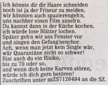 Skandal im Sperrbezirk April 26, 2020 by flock with no comment Dabei könnte Mann es viel leichter haben. Diese Dame würde einen Haarschnitt (und sich selbst) sogar verschenken… Previous Post Grad vorhin in der Unterfahrt: Brändle / Schwager / May Next Post Corona-Schnipsel