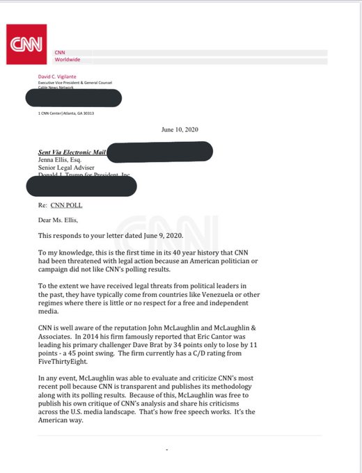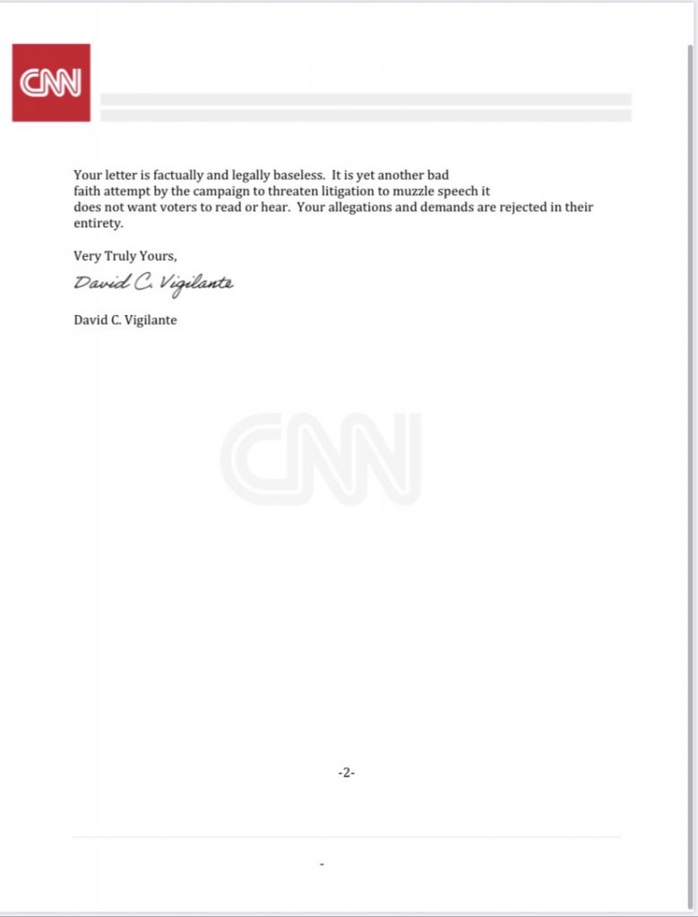 Ich weiß nicht, was ich absurder finden soll. Dass 45 von CNN verlangt, sich zu entschuldigen, weil sie Umfragen veröffentlichen, in denen Biden mit einer komfortablen Mehrheit vor ihm liegt oder dass der Justiziar des Senders, der dieses Ansinnen in einem öffentlich gemachten Brief abschlägig bescheidet, den wunderbaren Namen D. C. Vigilante trägt.