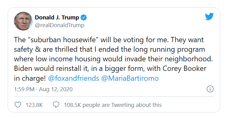 * … also dieser irrsinnige Stepford-Wives-Archetyp, den 45 wohl im Sinn hat, wenn er davon spricht, dass die Frauen aus den Vorstädten ihn wählen würden, weil Joe Biden ihnen nämlich schwarze Plünderer und Vergewaltiger auf den Hals hetzt, sind auch nicht mehr, was sie mal waren. Sie stehen auf und wehren sich gegen dieses alberne sexistische und rassistische Szenario. Pars pro toto: das suburbanste Housewife von allen, Marjorie Jacqueline Bouvier-Simpson, aka “Marge”.