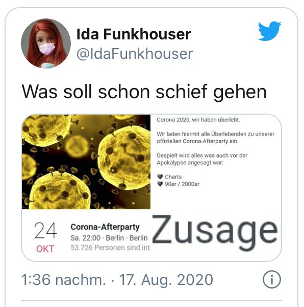 Die Pandemie ist rum. Da schau her. Wenn man mir nicht diesen Screenshot aus dem August geschickt hätte, würde ich mich immer noch maskiert von Menschen fernhalten. Aber so? Berlin, Berlin, wir fahren nach Berlin: Auf zur Corona-Afterparty!