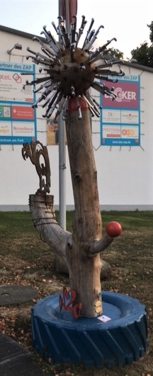Möglicherweise liegt es am blauen Traktorreifensockel, dass mir bei dieser Skulptur vor dem Emmelshausener Gemeindezentrum immer ein Sexshop für alle Varianten des erotischen Spektrums in den Sinn kommt? Wahlweise Virus-Allegorie.