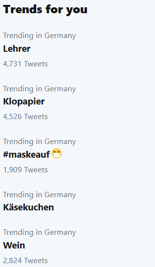 # Corona-Déjà vu. Vorhin, vor dem Supermarkt: Ein Herr schiebt im Schweiße seines Angesichts einen mit Klopapier übervoll beladenen Einkaufswagen Richtung Parkplatz. Der könnte den ganzen 2. Lockdown lang durchgehend Durchfall haben und hätte danach immer noch Vorräte.