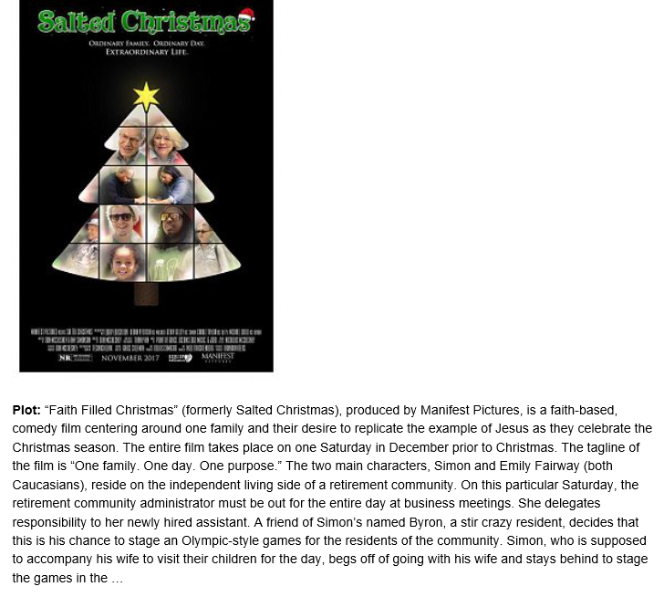 … in the hope of bringing some Christmas spirit (in the form of laughter and fun) into the community. Now on her own, Simon’s wife Emily convinces her friend Betty (a skeptic) to join her for the day. They proceed to the home of Emily’s son, Walter, who it turns out is African-American and was adopted when he was 12 years old. Walter and his wife Ruth (also African-American) now have two adopted 17-year-old sons in the home (one African-American and one Caucasian). There is also a Hispanic 3-year-old female foster child in the home. Walter and Ruth proceed to take the foster child to a visit with her biological mother while Emily and Betty join her adopted grandchildren to undertake some evangelism on the beach. One of the adopted boys is hoping to see his biological mother (a homeless woman) while they are on the beach, which does, in fact, take place. The film is a drama with numerous moments of humor and highlights a family actively involved in foster care, adoption, homeless ministry, and nursing home ministry, and the moments those ministries create. It is a film about the joyous adventure which constitutes the Christian life. Because we filmed in South Florida, we were able to create a rich tapestry of cultures and ethnicities throughout the film.