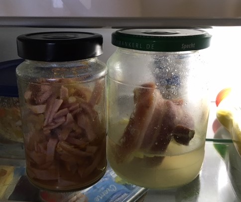 Im Laufe des Tages erfolgt die Aufklärung. Die Vermieterfirma hat nicht etwa Dr. Frankenstein angeheuert, nein, Manfred (der Carnivore Manfred aus diesem blogpost https://flockblog.de/?p=40400) kühlt hier nur zwei seiner drei täglichen Fleischmahlzeiten. Gegen 10:00 Uhr singt er den “Senft” aus seinem persönlichen Würzsoßenvorrat in der Gemüseschublade herbei (“Jo, wo issa denn, mei sißa Senft, mei sißa Senft, mei sißa Senft?”) und danach ist das linke Glas verschwunden und zu Mittag gibts – “Mahalzeiheit, Mahalzeiheit, Mahalzeiheit” – nach einem freundlichen “Ping” der Mikrowelle “mei Wammerl, mei guads, mid am Kraut, am Kraut, juhe”.