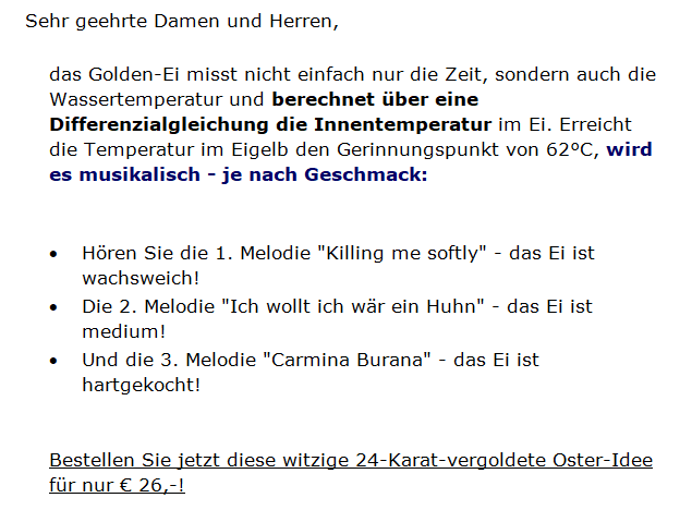 Neulich hatte mir jemand geraten, für das optimale Dottererlebnis Eier vor dem Kochen heftig zu schütteln. Obwohl ich mich in meinen Shake-Anstrengungen lässig mit Bonds Barkeeper messen lassen zu können glaubte, muß ich irgendwas falsch gemacht haben: der Dotter meines heutigen Frühstückseis war unverändert dotterförmig, das Eiweiß hingegen von eher widerlicher hüttenkäsig-pickeliger Textur.