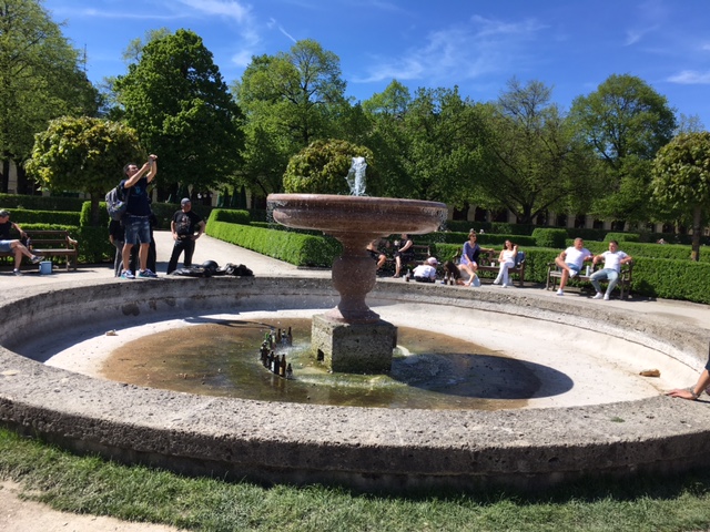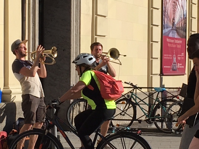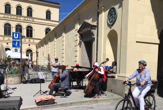 Genau: Musiker musizieren (sogar ein Klavier wurde aufgestellt), Kinder juchzen in den gerade aufgedrehten Brunnen, oben nehmen Elstern ausgedehnte Bäder, unten werden die ersten Biere unter den sprudelnden Fontänen gekühlt, ein Coiffeur bietet unter freiem Himmel Haarschnitte gegen Vorlesen an, Schattenbänke sind unter dem weiß-blauen Himmel begehrtes Gut und die Vögel zwitschern, die Boule-Kugeln klackern, Starbucks macht mit zuckerbonbonfarbenen Getränken das Geschäft seines Lebens, die Sonne lacht und München leuchtet, leuchtet, leuchtet.