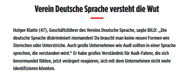 … hat natürlich niemand so sehr wie die BILD-Redaktion und geifert über ein Thema, das sie offensichtlich arg umtreibt. Wie kann ein Autobauer nur auf die hanebüchene Idee kommen, seine Mitarbeiterinnen und Mitarbeiter zukünftig nicht mehr als “Audianer”, sondern mit „Audianer_innen“ ansprechen zu wollen?