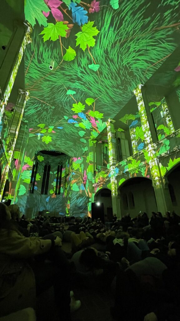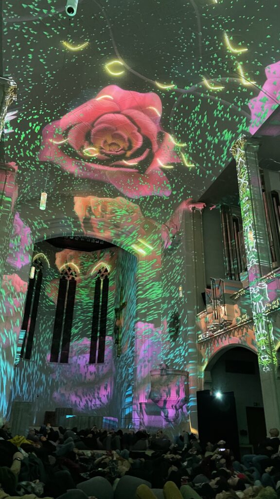Ja, passt. Wir hatten Sitzplätze auf Stühlen gewählt und damit auch einen guten Blick auf die drei hohen Fenster hinter dem Altar – im Gegensatz zu den Love-In-Lümmelpolstern auf dem Boden mitten im Kirchenschiff. In dieser ersten Phase schwirren zu Musik von Mahler abstrakte monochrome Formen, mehr noch Linien, über den “Himmel”.