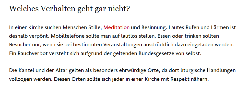 Wahrlich, wir leben in herrlichen Zeiten! Wie ich darauf ausgerechnet in Zeiten wie diesen komme? Nun, die Redaktion der FAZ hat sich bemüßigt gefühlt, all dem gottlosen Pack, das wg. Tradition und/oder Oma zu Weihnachten eine Kirche aufsucht, einen Benimmkatalog, quasi Kirchenknigge, für diesen Besuch aufzugeben. Und das in diesem unseren Lande, wo sogar noch die Generation nach meiner erlebt hat, dass man wegen seiner Zugehörigkeit zum falschen (christlichen!) Glauben diskriminiert wurde. Wie wunder-, wunderschön!