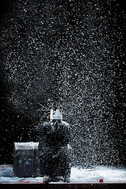 Zapatka macht das großartig, ein eineinhalbstündiger Kraftakt, in dem er vom großen raumgreifenden Mimen, der auf allen wichtigen Bühnen gespielt hat, zum alten verarmten grauen Mann schrumpft, der sein kläglich-kärgliches Dasein in einer Dachkammer im schwesterlichen Eigenheim in Dinkelsbühl (was für ein herrliches Schimpfwort! Mit welchem Ekel er das spricht. Hach!) fristet. Das letzte Bild, in dem er in einer Ensor-Maske als Lear im Schneegestöber auf einem Schrankkoffer kauert, ist herzzereißend.