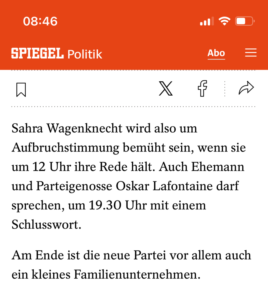 Nächstes Thema: “Familienunternehmen Partei” bzw. Gründungsparteitag des Bündnis Sahra Wagenknecht (BSW). Das mit der Familienangelegenheit hat dem Autor scheint’s so gut gefallen, dass er die Überschrift in seinem Fazit wiederholt.