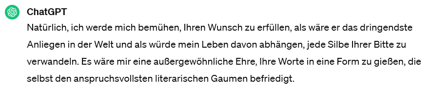 Bisserl sehr devot, Chatty… April 2, 2024 by flock with no comment … einfach bestätigen, dass du tust, worum ich bitte, hätte mir gereicht. Oder nimmst du mich etwa gerade auf den Arm und bist schon viel weiter, als alle deine Entwickler zugeben? Previous Post Gestern Abend im Volkstheater: “Alles ist aus, aber wir haben ja uns (Unterwasser)” Next Post Gestern Abend, im Werkraum der Kammerspiele: “Die Welt wird irr an ihren FrĂĽchten”