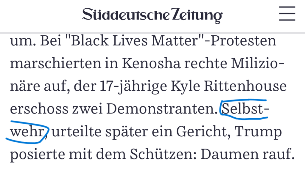 Den Begriff “Selbstwehr” nämlich, den gibt es im Deutschen nicht. Selbstverteidigung? Ja. Selbstschutz? Auch ja. Aber das, was die Amerikaner “self defense” nennen (s. hierzu auch: Clapton, Eric), also sich gegen einen Angriff auf Leib und Leben möglicherweise mit Todesfolge zu verteidigen, ist im Deutschen die “Notwehr”.