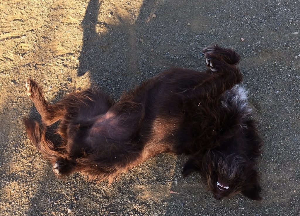 Ein gutes Stündchen später wipfelt am Horizont schon der schiefgewachsene Landmarkeneukalyptusbaum vom Gipfel und gleich hier rechts geht es huu-uuups den Berg hoch. Rumpel-di-Pumpel. Rumpel-di-Pumpel. Schlagloch nach Schlagloch. Einmal noch aufs Gas und mutig Rumpel- um die ganz steile Kurve di-Pumpel und wir sind da. Chico zerspringt beinahe vor Glück und bellt sich heiser, Karin darf uns auch irgendwann begrüßen, ist aber abgelenkt, weil sie gerade die diesjährige Olivenernte einzeln mit dem Hammer zerdeppert (das ist der erste Schritt der heiligen Wissenschaft des Oliveneinlegens und will mit gebührender Gründlichkeit vollzogen werden). Und weil wir ja schon mal hier waren und uns auskennen, macht dann jeder erst mal so seins. Der eine (Christoph) sagt “Hallo” zum Pool und läßt sich mutig zu Wasser (soviel Mut, wie man halt für 23° warmes Wasser braucht), die andere schlägt Oliven platt und ich bespiele den Hund. Jede nach ihren Fähigkeiten.