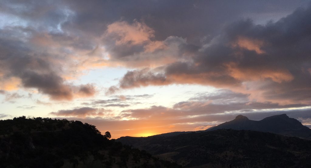 Die Fahrt nach Algodonales führt uns an lauter Déjà vus vorbei. Die Landschaft ausgedörrt, die Felder müdgelb-strohig kahl, die Rindviecher behörnt, die Schafe auch, hie und da qualmende Feuer – bloß der Himmel über der Sierra ist nicht, wie sonst immer, strahlend blau, sondern mit schweren Wolken verhangen und macht auf Drama. Soll er doch. Bei über 25° ist uns das so recht vom Corazón her wurscht bzw. chorizo. (Jaha, ich übe das, was ich für Spanisch halte.)