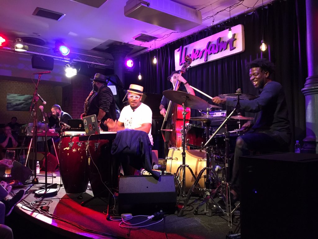 Etienne Charles (Trompete, Congas) und seine sagenhaft guten Mitmusiker – Saxophonist “The Godfather” Godwin Louis (ein lĂ€ssig die Zweizentnerlatte reiĂender Riese mit einem goldenen Uhrarmband in der Breite einer DorfstraĂe am einen und Holzperlen- und MuschelschnĂŒre bis fast zum Ellenbogen am anderen Arm), Pianist Jeremy Dumont (ein bis dato unbekannter Zwilling von LĂ©on, dem Profi), Bassist “Cool wie eine Gurke*” Or Bareket und Klassenkasperhampelmann Harvel Nakundi an den Drums – hauen dem Publikum den Sound karibischer Inseln, gepaart mit KlĂ€ngen aus den Louisiana Swamps sowie allem, was sie ĂŒber Jazz wissen, um die Ohren. Ganz sehr wunderschön!