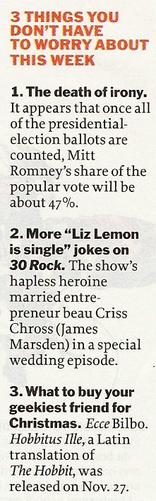 Und weil das Leben nicht nur die schönsten Geschichten schreibt, sondern manchmal durchaus eine ironische Wendung einbaut, finde ich es sehr gelungen, daß das offizielle Wahlergebnis für Mitt Romney nun bei exakt 47% aller abgegebenen Stimmen liegt.