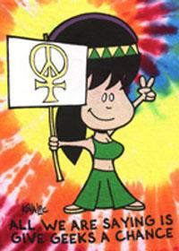 David, Commander der Battlestar Galactica, feuerrotes hüftlanges Haar, trägt – nicht ohne Selbstironie – ein T-Shirt (links), das um eine Chance für Geeks bittet. Jemand erzählt mir, David sei BSG*-Veteran und -Meister, das sei seine 150+xte Partie und er habe noch fast jede gewonnen. Moment a mal, let’s do the math: eine durchschnittliche Partie BSG dauert mindestens drei Stunden. 150×3 ergibt 450 Stunden. Ausgehend von einem 8-Stunden-Tag kommt man auf 56 Tage, also knapp zwei Monate, die der Mann am BSG-Brett verbracht hat. Und das auch nur, weil ihm irgendein anderes interstellares Kampfspiel (ich habe den Namen vergessen) nicht mehr genug Herausforderungen zu bieten hatte. Selbst wenn man dem Geek eine Chance geben wollen würde: der hat ja nie Zeit.
