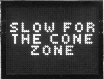 Was ein bißchen klingt wie der Titel eines Sommerhits aus Jamaica (Yaman!) ist in Wirklichkeit ein Warnschild und soll verhindern, daß man Bauarbeiter auf der Autobahn umfährt. (Cones sind orange-weiß gestreiften Pelonen).