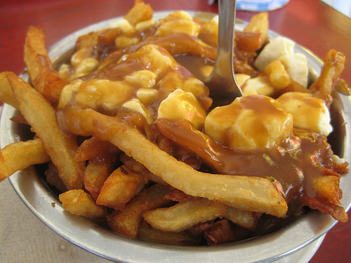 Bei einer Poutine handelt es sich um eine reichliche Portion Pommes, getränkt in schöner dicker brauner Soße und überbacken mit nahrhaftem Käse. Der Vitamingehalt dürfte im negativen Bereich liegen.