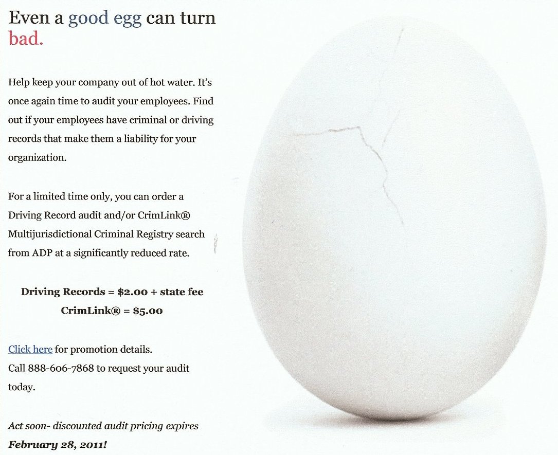 Wenn’s in Deutschland zur Zeit um Eier geht, dann wohl meistens wegen des Dioxingehaltes. In Amerika bekommt man von der Payroll-Company ein Angebot fĂŒr Mitarbeiterselektion zum SchnĂ€ppchenpreis, um die guten von den “rotten eggs” zu scheiden. Das ist gĂ€ngige Praxis und legal, auch wenn die Wortwahl an Mengele erinnert.
