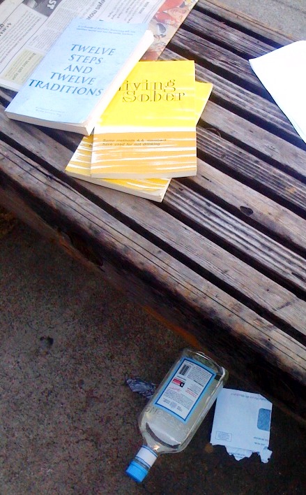 Jemand hat sich hier in der LektĂŒre von Erbauungsschriften ergangen, wollte wohl in 12 einfachen Schritten zu einem neuen nĂŒchternen Leben finden. Ein leerer Briefumschlag und eine geleerte Flasche zeugen davon, dass er sich wieder seine alten Maxime zugewandt hat: “What’s the use of getting sober if you gonna get drunk again?”